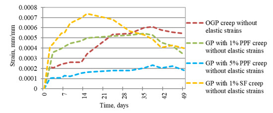 If the elastic strains are taken away, the relation of Figure 6b for the first 28 days is still visible in Figure 7. It is apparent from reviewing Figure 6b and Figure 7 that the amount of elastic strains for the tested specimens varies from 68.5% to 80.9%. The elastic strains for tested geopolymer composites are 80.9%, 77.6%, 75.0%, and 68.5% for specimens with 5% PPF, 1% SF, OGP, and 1% PPF, respectively. The highest creep strain was observed in the specimens that were reinforced with 1% steel fibers. The lowest creep strains were observed for the specimens that were reinforced with 5% polypropylene fiber.