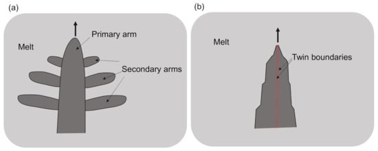 Dendrite crystals appear in the solidification processes of various materials including metals [1,2,3], metallic alloys [4,5,6,7,8,9,10], semiconductors [11,12,13,14,15,16,17,18,19], organic materials [20,21,22,23,24,25], and so on. It has been shown that the growth shapes and growth mechanisms of dendrites are different between metallic alloys [26,27] and semiconductors [13,18]. Although the solute and thermal diffusion in the liquid are key in determining the growth shape and growth velocity of dendrites in metallic alloys, the kinetics of atomic attachment at the reentrant corner formed at the front of dendrites due to the existence of twin boundaries determines the growth shape and growth velocity of dendrites in semiconductors. The typical shape of alloy dendrites is schematically shown in Figure 1a. Generally, a dendrite grows in a preferential direction to form a primary arm, and secondary arms extend from the side of the primary arm. On the other hand, the growth shape of the dendrites of semiconductor materials, such as Si and Ge, are different from that of metal alloy dendrites, as shown schematically in Figure 1b. At least two parallel twin boundaries exist at the center of the dendrites, the surface of the dendrites is bounded by facet planes, and the preferential growth direction is <112> or <110>, which is related to the existence of parallel twin boundaries [13,18]. This type of dendrite is called a “faceted dendrite” or “twin-related faceted dendrite”. Nagashio et al. showed that Si dendrites can grow preferentially in the <100> direction (<100> dendrite) in a highly undercooled melt when the extent of undercooling (ΔT) is more than 100 K [17]. The growth shape of <100> dendrites of Si is similar to that of alloy dendrites, that is, the <100> dendrite does not contain any twin boundaries (twin-free dendrite). To realize such a highly undercooled melt, a container-less levitation method was used [17]. In a normal solidification process using a container (crucible), it is difficult to maintain the melt in a highly undercooled state. Therefore, only faceted dendrites appear in the lower undercooling region, such as ΔT ≃ 10 K [28], in the solidification process of pure Si in a crucible. Recently, we directly observed the growth shape of dendrites of GaSb, which is a compound semiconductor with the zinc blende structure [19]. The growth scheme of GaSb dendrites could be explained by the Si faceted dendrite model. Thus, it has been shown that the types of dendrites depend on the material.