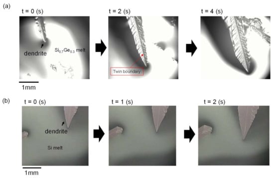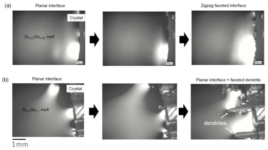 It was also reported that the instability of a crystal/melt interface like Figure 5b is initiated at a portion of the grain boundary in multi-crystalline Si due to the difference in thermal conductivity between the interior of the crystal grain and the grain boundary [74]. We also observed interface instability for Si-rich Si1−xGex (0 < x < 0.1) alloys [64,65,66]. In that case, it was shown that the critical growth velocity for interface instability to occur becomes lower with increasing Ge composition due to constitutional undercooling, and the transformation of the interface shape followed, as shown in Figure 5b. A question remained: if the growing crystal contains parallel twin boundaries and dendrite growth appears during directional solidification, does the dendrite growth appear before the interface instability or after the instability? Since it is difficult to artificially create parallel twin boundaries, we relied on chance and conducted the experiment many times, and were able to observe an interface with parallel twin boundaries. Figure 6a,b show snapshots of directional solidification from Si1−xGex melts. The two melt compositions are almost the same; (a) Si0.92Ge0.08 and (b) Si0.9Ge0.1. As shown in Figure 6a, the planar interface changed to a zigzag faceted interface due to the interface instability. Similar results for the transformation of the interface shape have been reported in pure Si [73] and Si-rich Si1−xGex [65,66]. In those cases, the growing crystal did not contain parallel twin boundaries. On the other hand, when the growing crystal contained parallel twin boundaries (Figure 6b), dendrite growth appeared at a portion of the parallel twin boundaries, while a planar interface was maintained for the other part. This shows that the dendrite growth appears before interface instability occurs. According to the Mullins–Sekerka theory, as explained in Figure 5, interface instability appears under a negative temperature gradient in the melt at the crystal/melt interface, while a planar interface is maintained under a positive temperature gradient [63], which was experimentally confirmed in single crystal Si [73]. The result observed in Figure 6b shows that the planar interface is maintained in the portion without dendrite growth; thus, the temperature gradient appeared to be positive. This result agrees with our previous report for pure Si crystals containing twin boundaries [75].