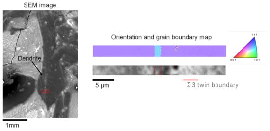 Structural analysis of dendrite observed in Si0.7Ge0.3 melt by SEM-EBSP. The SEM image is shown at the left. The orientation map is shown at the upper right, and the grain boundary characteristics in the region of the dotted red box in the SEM image at the lower right.