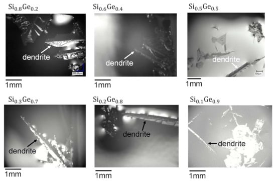 An in situ observation system composed of a furnace and a digital optical microscope was used for the experiments [69]. Pure Si (99.9999%) and Ge (99.999%) were mixed with different compositions. Before the experiments, both of the raw materials were cleaned. First, they were ultrasonically cleaned in acetone to remove oil components from the surface. After rinsing with ultrapure water, the samples were dipped into aqueous HF solution to remove the surface oxide layer. Then, the cleaned Si and Ge were put into a silica crucible with a size of 22 × 12 × 11 mm, which was placed into a furnace. The furnace has a window to observe the sample surface by means of the digital optical microscope. The furnace temperature was controlled by two zone graphite heaters. After melting of the raw materials, the temperature was kept for 30 min at higher than the melting temperature to allow the mixing of Si and Ge. Then, the inside of the furnace was cooled to promote solidification.