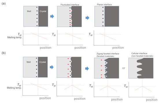 Schematic illustration of the shape transformation of crystal/melt interfaces. (a) A planar interface is maintained due to a positive temperature gradient in the melt at the interface, and (b) a zigzag faceted or cellular interface is formed due to a negative temperature gradient.