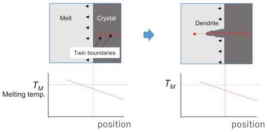 Therefore, it was indicated that dendrite growth appears even in a positive temperature gradient when a crystal contains parallel twin boundaries, as shown in Figure 7. In this case, the amount of undercooling at the tip of the dendrite is smaller than that at the planar interface; however, the atomic attachment at the tip of the dendrite is known to be much faster than that at the planar interface due to the formation of a reentrant corner at the dendrite tip [18], and thus a dendrite can be grown.