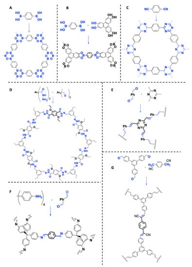 Examples of different reactive groups which allow DCC for COF formation and corresponding connecting moieties; (A) boroxine [], (B) boronate ester [], (C) triazine [], (D) hydrazone [], (E) vinylene with triazine [,], (F) imine [], (G) full vinylene C-C bonded [,] (see the following references for full structures).
