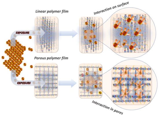 Illustration of the films formed from linear and porous polymers, and the comparison of their interaction with the guests or analytes after exposure.