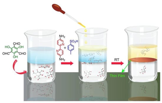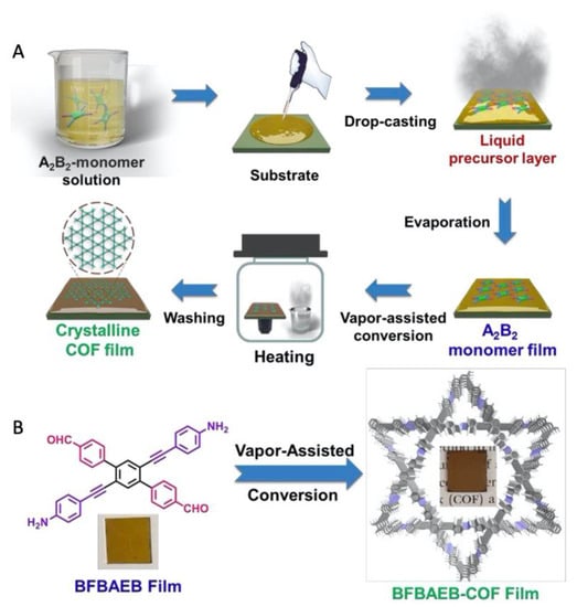 Another similar approach is the vapor-assisted film formation, which is basically drop-casting of the co-monomers and allowing them to react in a closed cup with the help of solvent vapor (Figure 3) [,]. The film properties can be adjusted by changing the vapor exposure time, concentration of the co-monomers, and the coating style (e.g., spin coating, drop-casting, dip coating), which gives more control on the output when compared to the previous “in-situ” method.