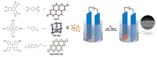 Aside from growing COFs on the substrates from precursors, depositing the formed COF particles on surfaces has also been studied. There are examples of forming COF films from their dispersed powders via spin-coating, and the films obtained were able to be utilized in solar cells [,]. Additionally, suspending COF powders in a highly viscous polymer matrix and the subsequent film formation was also reported, and the films were applied in organic light-emitting diodes (OLEDs) []. Synthesis of colloidal COF particles and the subsequent casting of their films from those solutions were also presented []. Spray coating of COF powders dispersed in inks to yield large area COF films was another interesting method []. Moreover, electrophoretic deposition of COFs onto substrates was also successfully presented in the literature (Figure 5) []. Aside from reporting a novel method for COF film formation, another interesting piece of information in this article was the deposition of all of the three structurally different COFs (see Figure 5) took place on the positive electrode due to their negative surface potential [].