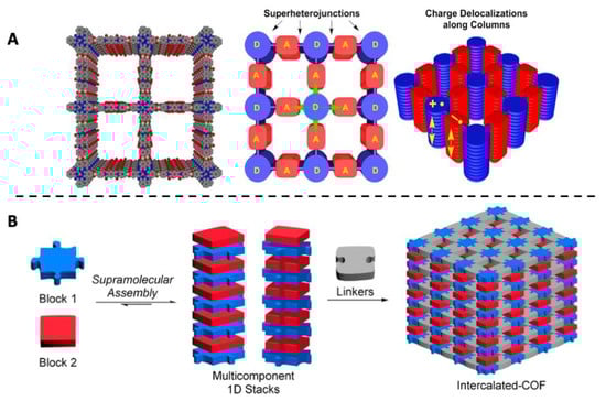 On the other hand, it is better to keep in mind that mixing the conventional and unconventional can yield unique behaviors, which may lead to revolutionary outputs. Therefore, rational design strategies to combine those variables should be an option to enrich the portfolio of such materials. For example, the cross-conjugation [] in common COFs can also be an asset for electronics [,] as well as some irregularities along the structure [,]. Furthermore, donor-acceptor COFs have a tendency to form nearly perfect donor-donor and acceptor-acceptor eclipsed stackings leading to excellent charge separation and extended bicontinuous electron/hole conducting columns (Figure 6A), which is unlike slipped/tilted alternating intermolecular donor-acceptor overlaps of the ordinary (linear and soluble) conjugated polymers [,,,]. Yet, this strict order in COFs might also result in a poor charge delocalization through the COF interlayers []. Recently, Li et al. showed it is possible to react a donor-acceptor charge-transfer complex via DCC to form COFs []. In that work, an aldehyde functionalized acceptor unit previously interacted with a non-functionalized donor compound to produce the charge-transfer complex, which was further reacted with an imine crosslinker to yield a COF having donor-acceptor stackings (Figure 6B) []. Additionally, performing band-gap engineering via post-synthetic linker exchange on already formed COFs or in-situ linker doping may result in alternation on the structure, and lead to interesting electronical properties [,,,,].