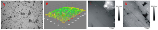 An example optical microscopy image of the surface of each sample and AFM images of the scanning areas of 10 × 10 µm are shown below in Figure 1. The optical microscopy images indicate that the surfaces of the tested samples are heterogeneous and not totally covered. From the microscopic images, it is possible to conclude that part of the GC surface is unmodified carbon, an uncovered surface, or microcracks with carbon in a small gap, probably due to a nonformed nucleus during the electrodeposition step. The formed film was evaluated with ImageJ software. A cross-sectional view is generated from the optical image and presented as the ZY or ZX planes. The obtained AFM images characterize the surface locally, and scans at different locations show noticeable differences in surface roughness. According to the AFM images, the mean image data plane (Rq) calculated on 100 μm2 regions for two different positions on the surface varies from 107.3 down to 35.5 nm for different film thicknesses (900.8 and 280.8 nm; Figure 1C,D).