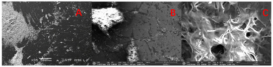 SEM results with three different magnifications of the electrode surface: (A) 35× (B) 1000× (C) 8000×; film was electrodeposited on a polished glassy carbon electrode (Edep = −0.850 V; tdep = 60 min).