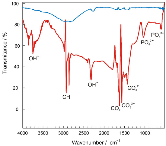 FTIR spectroscopy is a useful method to verify the presence of functional groups in synthesized compounds or materials in a wide wavenumber region. Figure 3 shows the FTIR spectra of the bare (blue line) and HAp-modified (red line) GC electrodes prepared as described in the Materials and Methods section (Section 2).