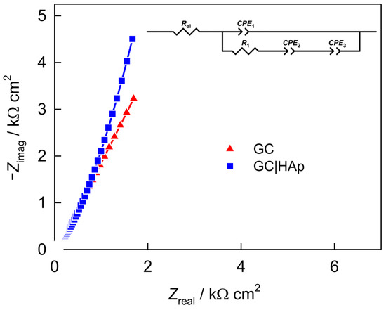Interference properties, as well as the surfaces of modified and nonmodified electrodes and the absorption of an optimized HAp film on the GC electrode surface, were investigated using electrochemical impedance spectroscopy (EIS) in 0.2 M KNO3 (pH = 4). Figure 4 shows the impedance data as Nyquist plots, obtained for bare GC and modified HAp/GC via the electrodeposition process, as described in the Materials and Methods section (Section 2). Impedance data were fitted by a suitable electrical equivalent circuit (EEC) model, employing the complex nonlinear least-squares fit analysis [40] offered by Solartron ZView® software. The fitting quality was evaluated by the chi-squared and relative error values, which were of the order of 10−3–10−4 and below 5%, respectively, indicating that the agreement between the proposed EEC model and the experimental data was good. The total impedance, Z of the investigated electrochemical system is the sum of the ohmic resistance and the impedance of the electrochemical interface (Zel + ZHF + ZLF) and is described by the transfer function in Equation (1).