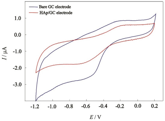 These measurements were carried out without oxygen removed from the solution. The overpotential of hydrogen reduction on the HAp/GC electrode was very low. The presence of O2 affects the background. The obtained voltammograms revealed an intensive reduction signal at −0.5 V and an oxidation signal at −0.2 V, corresponding to the full reduction of oxygen. The oxygen reduction reaction ideally takes the four-electron pathway (O2 + 4H+ + 4e− ↔ 2H2O). The potential of this reaction is similar to that reported for the oxygen reduction reaction at a bare glassy carbon electrode [42]. Afterward, the modification of the electrode reduction/oxidation peak that corresponds to oxygen is significantly reduced, which suggests a low sensitivity of the electrode to the oxygen present in the solution. The overpotential of hydrogen reduction at the HAp/GC electrode was very low. The presence of dissolved O2 could also reduce the potential window of the bare GC electrode, but the modified electrode could be used in a wider potential window with regard to the bare GC electrode.