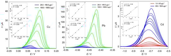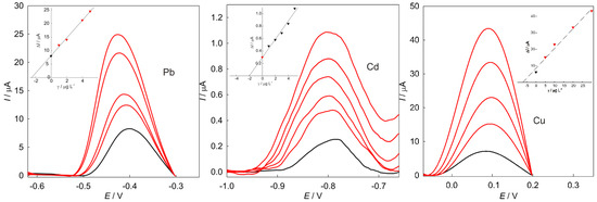 Such modified electrodes were subsequently used for the determination of heavy metal cations individually with optimized parameters. The SWCSV procedure was established by monitoring the influence of the applied potential increment (∆Es), frequency (f), pulse height (∆Ep), accumulation potential (Eacc), and accumulation time (tacc) on peak currents (Ip), and the obtained results are shown in Table 2. The SWCS voltammograms were obtained by the standard addition method (Figure 6). The calibration plots of the HAp/GC electrode towards copper, lead, and cadmium were derived from the obtained voltammograms, and the results are shown as insets of Figure 6.
