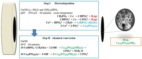 Electrochemical deposition, an environmentally friendly method for coating formation, represents an ecologically clean and safe approach with unique advantages due to its ability to create a uniform coating on curved surfaces and other complex geometries. Additionally, the process is economically acceptable and simple, as it can be performed at room temperature, and the morphology of the coating can be easily controlled by changing the time and potential of precipitation, concentration, and pH of the electrolyte or by adding a growth guide [31,32].