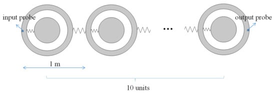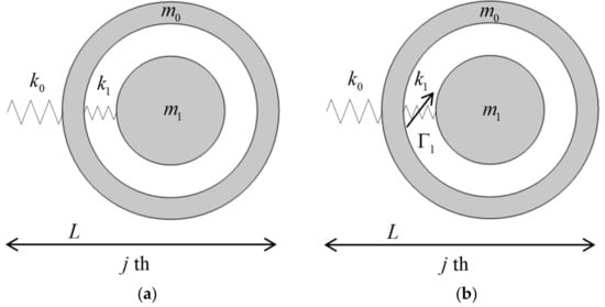 On the other hand, the real material is defined by the elastic modulus, while the tensile parameter in the simulation is characterized by the spring constant. Although it is easy to control the mass magnitude for each material, it is hard to define the effective spring constant. Scholars have made many attempts in parameter equivalence [] and parameter identification [] research. For example, a classic mass-in-mass structure is already provided by Liu []. The composite material is composed of a solid core material with a relatively high density and an elastic soft material coating. The core material corresponds to in our structure. The coating silicone rubber can be regarded as , with epoxy as the hard matrix material, which we can refer to as and . The equivalent of the nonlinear spring model usually arranges two vertical springs on the basis of the original linear spring-mass structure [].