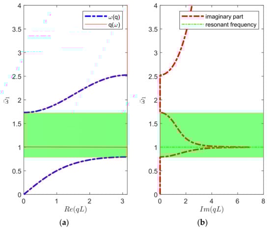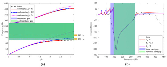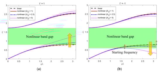 We use the structural parameters in Figure 2 to calculate the dispersion relation. It is easy to identify from the nonlinear force , including cubic term, that when the degree of nonlinearity is greater than zero (), it performs a nonlinear hardening system. In addition, when the degree of nonlinearity is smaller than zero (), it performs a nonlinear softening system.