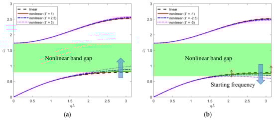 Figure 4 describes the variation of the dispersion relation with the degree of nonlinearity. The flat blue arrow indicates the directional change of the starting frequency with . When (see Figure 4a), both the optical mode and acoustic mode curves move upward. The relative curves are all above linear conditions (black dashed line). The rising amplitude grows with the increase in the wave number, resulting in a narrowing of the band gap. Conversely, when the degree of nonlinearity is less than zero (, see Figure 4b), the curves are below linear conditions. The bound frequency would decrease, which leads to a wider band gap interval.