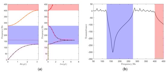 In Figure 7a, the calculated first band interval (126~276 Hz) between the acoustic mode and optic mode is marked in light blue shadow, and the second band interval (above 400 Hz) is marked in light red. The frequency interval where the transmittance calculated by COMSOL is less than zero corresponds to the forbidden band interval obtained from the analytical solution. It needs to be mentioned that the frequency of the transmittance peak corresponds to the position of the peak of the imaginary part of the theoretical solution (159 Hz). This indicates that the transmittance curve and imaginary part of the dispersion relation express both the speed and tendency of the wave propagating in the phononic crystal. They are consistent in revealing the principle of sound absorption.