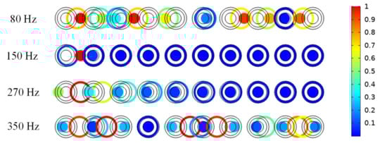 In addition, we plot displacement cloud images with frequencies of 80 Hz and 350 Hz outside the sound insulation interval and 150 Hz and 270 Hz inside the interval (see Figure 8). The first and last cloud images show that each cell is in a state of vibration, and there is no obvious energy loss when the frequency is not in the forbidden band. At the frequency 270 Hz near the boundary of the sound insulation interval, the input energy is gradually consumed after about five cells, and the energy transferred to the end of the chain reaches zero. Therefore, the lattice chain structure achieves the effect of energy absorption in the sound insulation frequency range. Typically, at the frequency 150 Hz near the peak of the sound insulation interval, the input energy is basically consumed by the local resonator of the first unit cell, and the energy transferred to the second cell is almost zero. This phenomenon illustrates the local resonance mechanism. It effectively explains why the absorption peak point corresponds to the local resonance frequency of the unit cell. The rationality of the local resonance method in terms of energy absorption has been perfectly embodied.