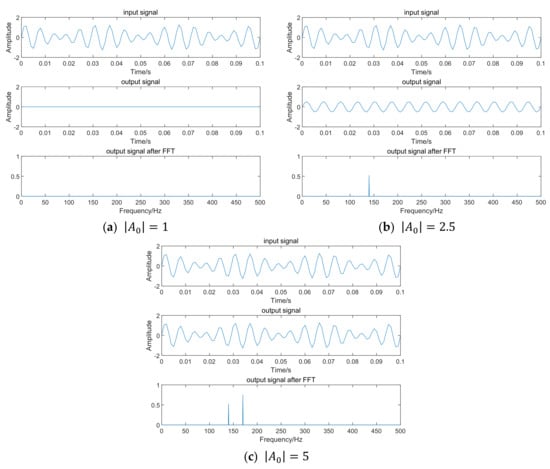 For a nonlinear hardening system, although there is no advantage in band gap widening, there are still some application values, such as a filter or a unidirectional conduction device [,,]. By introducing parameters that may produce an acoustic stop band, wave filters can be realized based on the amplitude-dependent characteristics of the nonlinear phononic crystal. Taking the parameters described in Figure 9 as an example, we assume that the input signal frequencies of the nonlinear phononic crystal structure include 140 Hz and 170 Hz. Here are three typical cases.