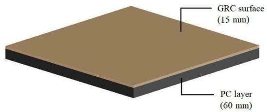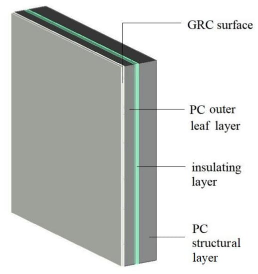 A glass-fiber-reinforced cement (GRC) is a type of composite building material made of cement and glass fiber as the main components while also including white sand, metakaolin, and fly ash []. Because of its excellent plasticity and durability, a GRC material can be used as an exterior leaf decorative material on the walls of buildings and is preferred over lacquer materials. The application of GRC not only protects the environment but also plays the role of architectural decoration in accordance with the concept of green buildings [,]. A GRC-PC exterior wall is a new type of prefabricated wall formed by a composite GRC surface layer on the outer leaf layer of a precast concrete (PC) wall panel, as shown in Figure 1, which not only ensures the structural bearing capacity of the members but also plays a decorative role. The use of this wall panel significantly reduces pollution, shortens the construction period, and improves the construction efficiency, thereby integrating the building, the structural, and the decorative elements through fabricated systems. It also has great advantages in improving the structural optimization of the conventional PC industry [,].