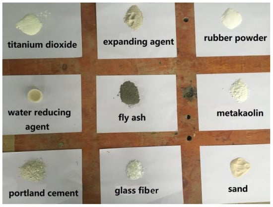 The raw materials required for the experiment were C30 concrete and GRC mortar. Among them, C30 concrete was produced by a concrete factory, and the GRC material was prepared by mixing in the experimental site; GRC materials are prepared by mixing the raw materials listed in Figure 2 in the experimental site.