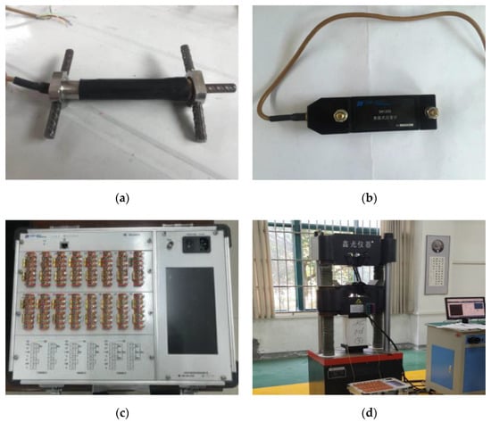 Equipment used in the experiment: (a) DH1204 embedded strain sensor; (b) DH1205 surface strain sensor; (c) DH3818Y static strain tester; (d) compression testing machine.