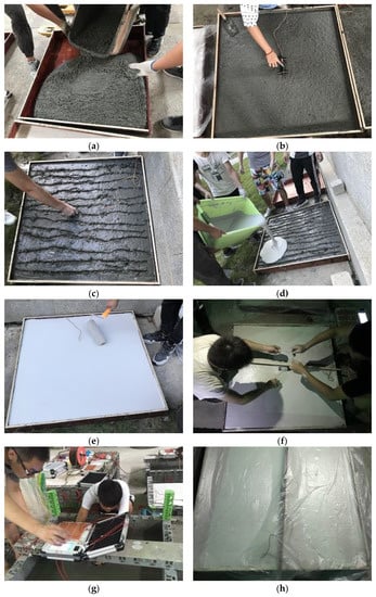 Experimental process: (a) pouring concrete; (b) placing embedded strain sensor; (c) surface processing; (d) pouring GRC material; (e) leveling the GRC surface; (f) placing surface strain sensors; (g) connecting the static strain tester; (h) covering film maintenance.