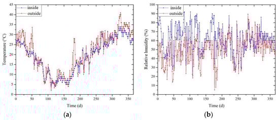 Temperature and humidity curves during the test period: (a) Indoor and outdoor temperatures vs. time curves; (b) indoor and outdoor humidity vs. time curves.