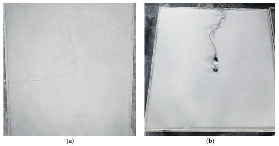 Before collecting data from the shrinkage experiment, we first completed the fabrication of each group of wall panels (Table 3) and the installation of strain sensors, as shown in Figure 6. The placement of the strain sensor, as shown in Figure 7, was determined by the distribution of S0 cracks, which is explained in the next chapter.
