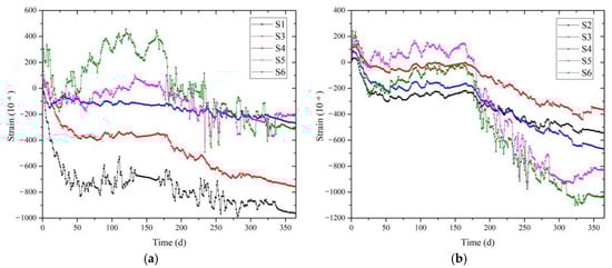 In order to have a visual display of the shrinkage deformation of all specimens, the strain curves of the S1 to S6 wall panels, shown in Figure 10, were plotted based on the data collected by the strain sensor during the experimental period. Figure 10a shows the strain of GRC layer of wall panels collected by surface strain sensor, and Figure 10b shows the strain of PC layer of wall panels collected by embedded strain sensor. The strain curves of S1 and S2, which represent pure GRC and pure PC panels, respectively, were used as the standard free shrinkage curves for the material. The other wall panels were classified in terms of environment and type of interface, and each set of strain curves was compared with the standard free shrinkage curve of the material as the crack resistance curve. The analysis was judged by the degree of adaptability, i.e., the more closely the crack resistance curve fit the standard free shrinkage curve of the material, the closer was the shrinkage of the corresponding composite wall panel to the standard free shrinkage, the lower was the resulting shrinkage stress, and the lower was the likelihood of panel cracking. Table 6 lists the maximum strain values of each group of wall panels.