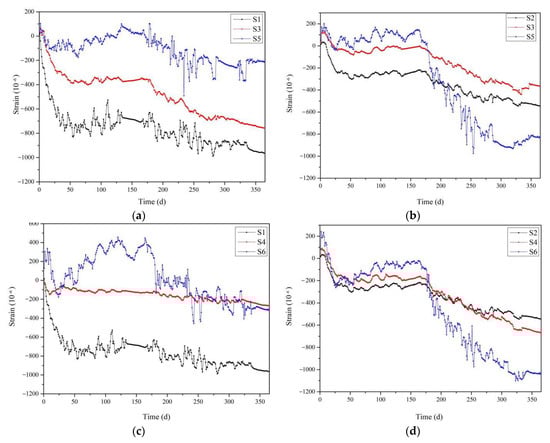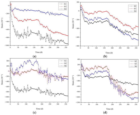 Strain curves for wall panels in different environments: (a) GRC strain curves of S1, S3, and S5; (b) PC strain curves of S2, S3, and S5; (c) GRC strain curves of S1, S4, and S6; (d) PC strain curves of S2, S4, and S6.
