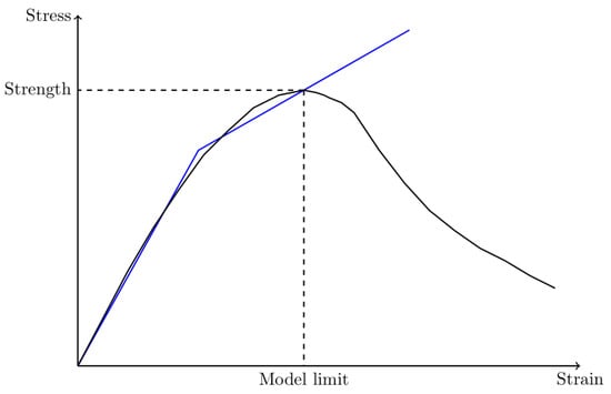 Previous work [7] proposed the use of the effective tensor of elasticity, obtained from numerical homogenization, the parameters of plasticity, such as the yield stress, and the hardening parameter as in concrete. At small values of plastic deformations, this approximation demonstrates good accuracy and can be used to describe plastic deformations until the body begins to collapse. In other words, our model considers concrete stress–strain dependence as piecewise linear, as shown in Figure 1. This model is supposed to be used for stresses below material strength [8].
