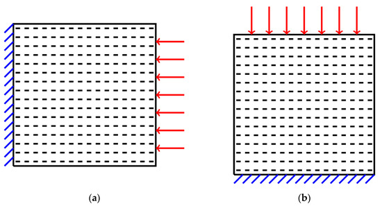 Figure 3. Schematic description of the tests: (a) Schematic description of test 1. Full anchoring of the left side and normal compression from the right. (b) Schematic description of test 2. Full anchoring from the bottom edge and normal compression from the top. - Compression along the vertical axis (Figure 3b);