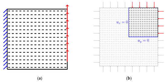 Figure 4. Schematic description of the tests: (a) Schematic description of test 3. Full anchoring of the left side and tangential compression from the right. (b) Schematic description of test 4. Symmetry conditions on the left and bottom faces and normal tension on the right and top faces. - All-round compression (Figure 4b).