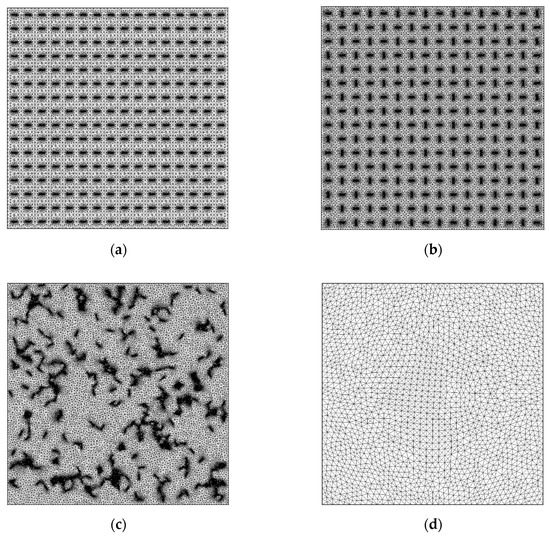 Computational grids: (a) Computational grid for case with unidirectional fiber distribution. (b) Computational grid for case with bidirectional fiber distribution. (c) Computational grid for case with random fiber distribution. (d) A coarse computational grid on which the numerical solution was performed using the effective parameters.