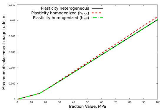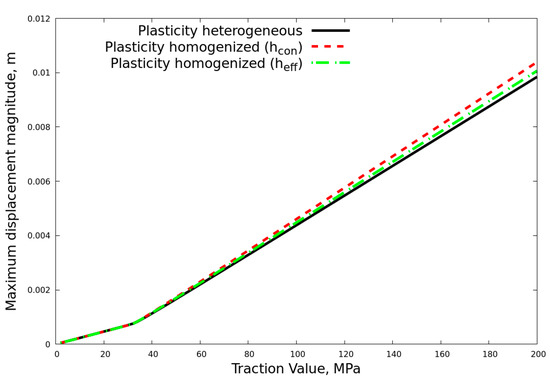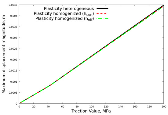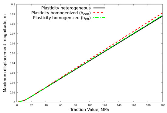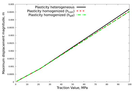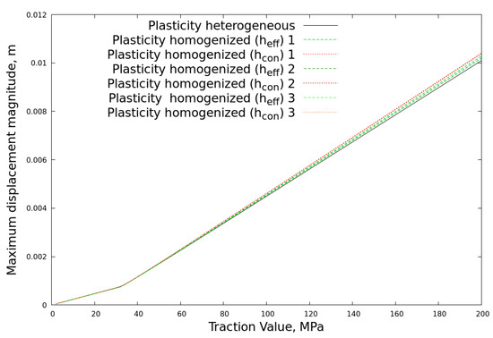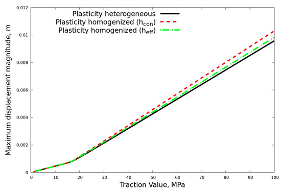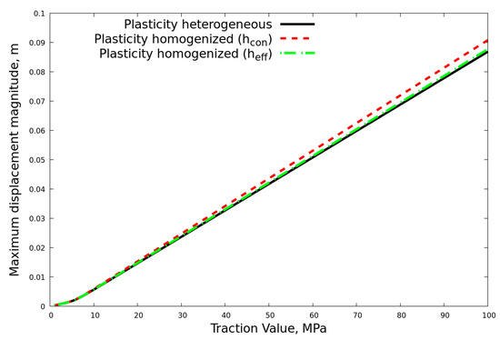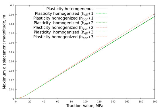 Additionally, for each case, we obtain the averaged stress tensors , which must correspond to solutions with effective parameters. Given the large value of deformation and, accordingly, the large value of stresses, it can be assumed that purely elastic deformations are negligible, and the ratio of stress and strain is described by the elastic-plasticity tensor. Thus, by solving the same problems on a homogeneous medium using the effective parameters, we must obtain the same stress values. However, since complete correspondence to the stress tensor by varying the value of the hardening parameter alone is hardly obtained, the agreement that it is necessary to obtain correspondence with the most essential components of the tensors is taken. Namely,