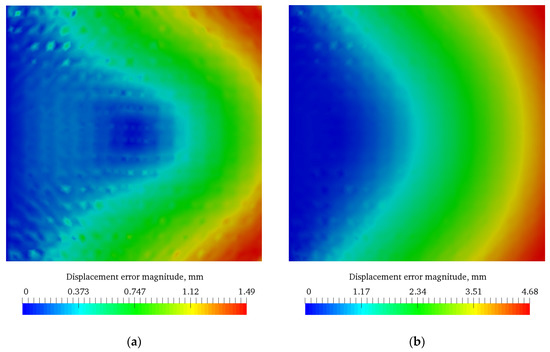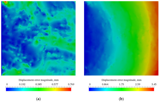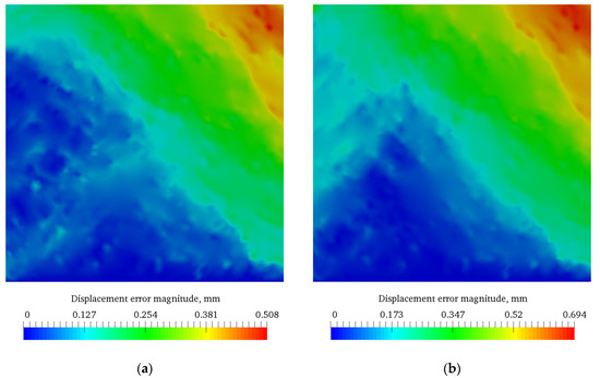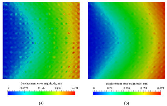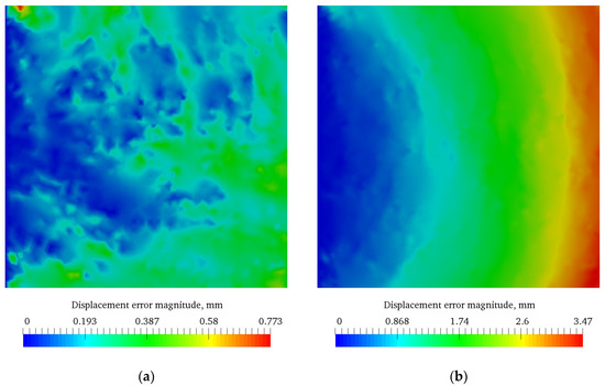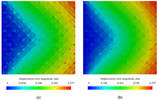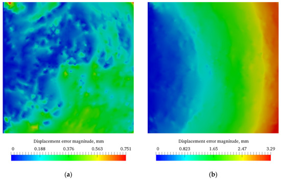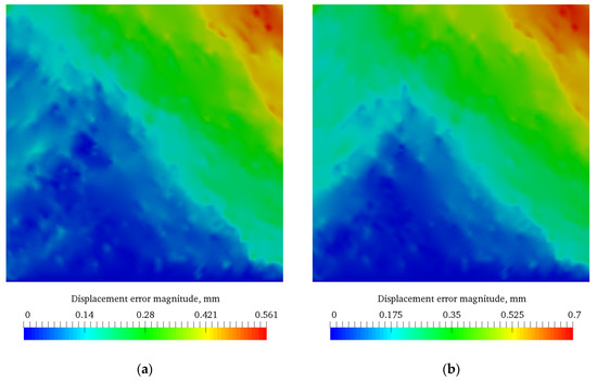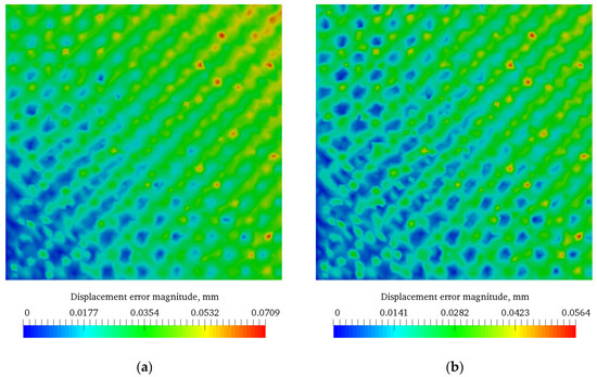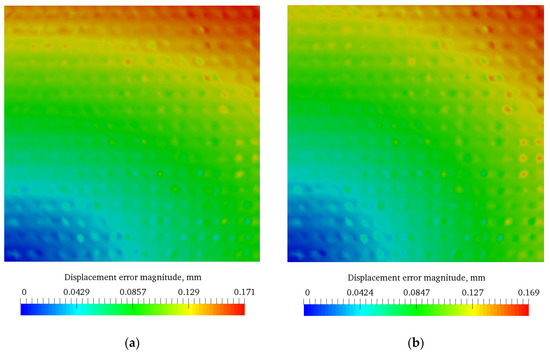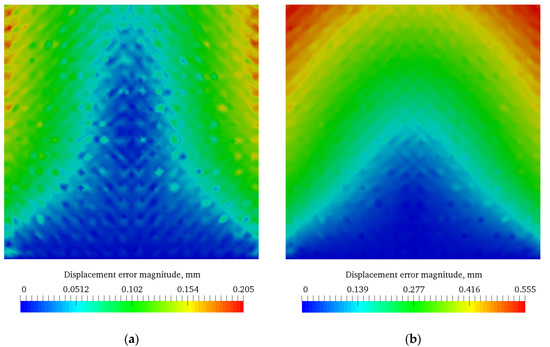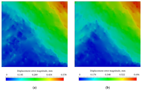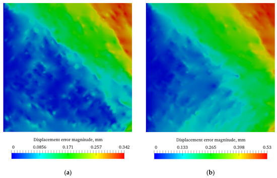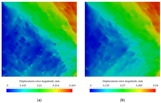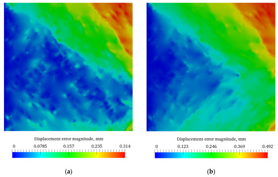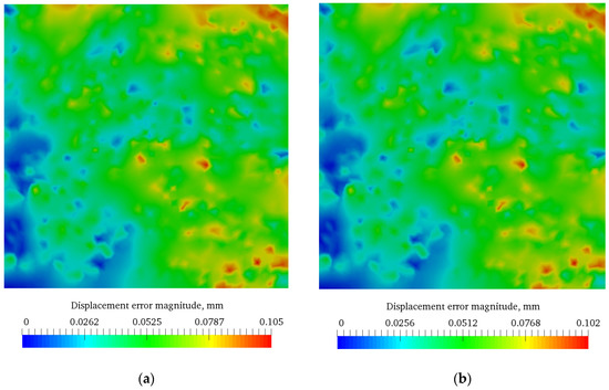 Distribution of the deformation error modulus for test 2 for bidirectional case: (a) When using effective hardening parameters; (b) when using the concrete hardening parameter.