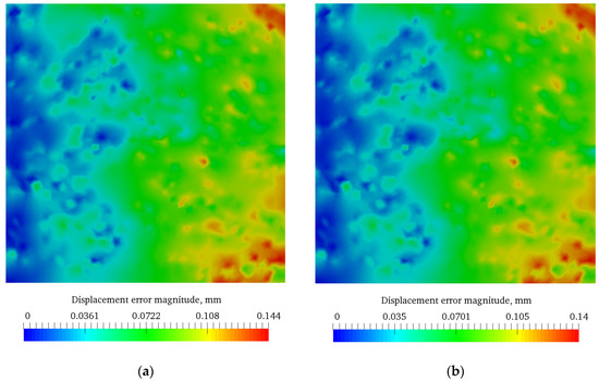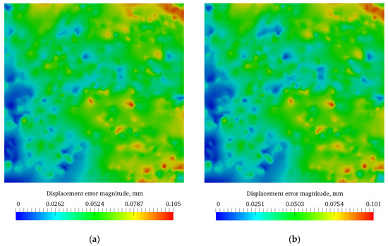 Distribution of the deformation error modulus for test 2 for random distribution case 1: (a) When using effective hardening parameters; (b) when using the concrete hardening parameter.