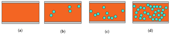 2D simulation model design with BST (orange) between two silver electrodes (gray) with randomly placed LDK inclusions (blue): (a) without the inclusions and (b–d) with 5%, 10%, 30% LDK inclusions in the BST region. The BST is 2 × 1 in dimensions and each inclusion is 0.16 mm in diameter.