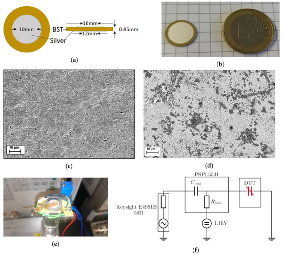 Manufactured varactor pellet with (a) schematic (top and side view) and (b) realized varactor. Microstructure analysis with scanning electron microscope images of (c) pure BST varactor (d) BST-MBO varactor. In the BST-MBO varactor, BST is shown by white color and MBO phases are shown by gray color. The measurement approach is shown with (e) pellet holder and (f) schematic circuit of the setup.