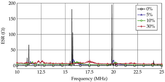 The reduction in ESR, for the peak at around 15.7 MHz and MHz, from around 200 to 100 for all configurations of inclusions, ensures the considerable suppression of acoustics. This suppression effect of around MHz and MHz is limited due to microstructural changes, with different arrangements for all inclusion configurations; however, with the 30% LDK inclusions, this limitation is more prominent. In conclusion, when comparing all the inclusion configurations, the extracted ESR and microstructural influence with different arrangements is lower for the 10% inclusion configuration than the other inclusion configurations for the whole range of considered frequencies. In fact, a trend of the increasing and then decreasing suppression of acoustics with the increase in LDK inclusions is witnessed here. This leads to the 10% inclusions configuration being selected as the most appropriate choice for the experiment, among the three configurations of inclusions considered.