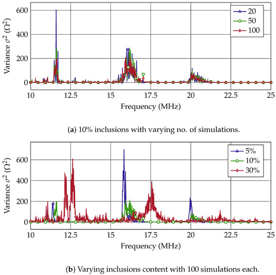 The cumulative variance of the extracted ESR for 10% LDK inclusions is shown in Figure 4a. It can be observed that, with the increasing number of simulations with different arrangements of LDK inclusion, the spread of extracted ESR reduces and the simulation environment becomes saturated with further changes in the spread of ESR. It should be noted that the narrow bandwidth of acoustics and small shifts in acoustic frequencies with different arrangements are the reason for the high variance here. Comparing the over 100 simulations, searching for different inclusion compositions, as shown in Figure 4b, is the minimum for a 10% inclusion configuration. This denotes that the 10% inclusion configuration shows less influence from microstructural changes with the different arrangement of inclusions. Finally, the extracted ESR for the model without inclusions is compared with the statistically adjusted extracted ESR of each model configuration, with inclusions shown in Figure 5. For comparison, the upper bound limit of the extracted ESR from the model with inclusions is considered. The upper bound is stated by the of 100 simulations with the addition of 3, assuming the extracted ESR varies according to normal distribution. This upper bound limit, statistically, considers the 99% confidence interval of the extracted ESR values for each frequency point in all the simulations considered.