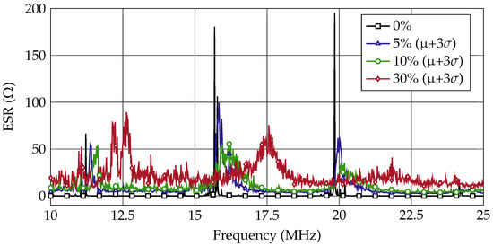 The extracted ESR for the model without inclusions is compared with the mean of all 100 simulations of each configurations of model with inclusions in Figure 3. The model without inclusion, shown with the squared black line, depicts the presence of acoustics at around MHz, MHz, MHz and MHz with ESR peaks. The significant reduction in ESR, for the peak around 15.7 MHz and MHz, from around 200 to under 25 for all configurations of inclusions, shows a considerable suppression of acoustics. On the contrary, the comparison does not show a reliable suppression for all the simulations of all configurations, as there can be a few outlier simulations, which do not show noticeable suppression. Hence, the variance study becomes critical in ensuring the model’s reliability towards acoustic suppression.