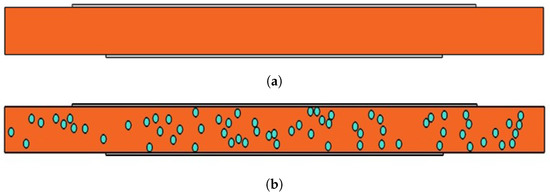 Modified 2D simulation model to adapt the realized varactor. (a,b) are the model without and with 10% LDK inclusions (blue) respectively. The electrodes are 0.01 mm thick and the BST (orange) region is 16 × 0.85 in dimensions close to the measured dimensions of the realized varactors. Each inclusion is 0.16 mm in diameter.
