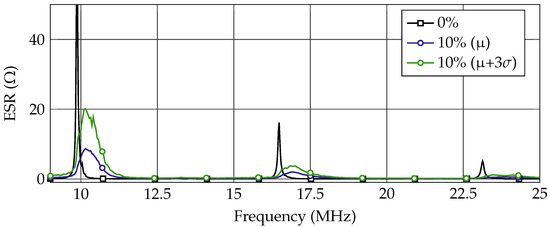 As the realized varactor is in different geometric form, as shown in Figure 2b, the model geometry is modified, similar to the realized varactor, which is shown in Figure 6. The modified geometry becomes more complex and requires more inclusions to cover the required inclusion composition in the BST region. The realized varactor’s widest cut slice, as shown in Figure 2a, is assumed for the 2D simulation environment, to consider the effects of its crucial dimensions. The suppression behaviour is already shown in the 2D model above and, hence, only 10% LDK inclusion is considered in the modified model. This modified model is simulated with 10% inclusions of LDK material to demonstrate the acoustic suppression behaviour expected in the realized varactor geometry. The comparison of the simulated ESR of both, with inclusions and without inclusions, is shown in Figure 7. Here, the upper bound limit of the extracted ESR for the modified model with inclusions is compared with the modified model without inclusions. The main advantage with the modified model is the position of the acoustics in the frequency range, which is expected to correctly match the extracted measured ESR. The distinct acoustic resonances are observed at around 9.9 MHz, 16.5 MHz and 23.1 MHz.