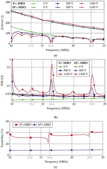 Figure 8a,b compare the extracted Q-factor and ESR from measured values for both configurations, respectively. A notable presence of acoustics in pure BST varactor can be observed at MHz, MHz and MHz, which decreases the Q-factor with increasing bias voltages. In comparison, an almost complete suppression of acoustics is observed at any bias voltage applied in the BST-MBO varactor. The ESR shows the same behaviour as predicted in the simulation environment earlier, shown in Figure 7. Due to the simplification with no dielectric losses, the simulation model cannot extract the absolute magnitudes of extracted ESR and the comparison can only be made for the relative changes. In terms of the position of acoustics in the frequency range, the distinct acoustics are present at similar frequencies of around 16.4 MHz and 22.9 MHz, confirming the simulation model’s viability. The difference in the position is around 6.4 MHz, which also conforms with the simulation model discussed in Section 2.