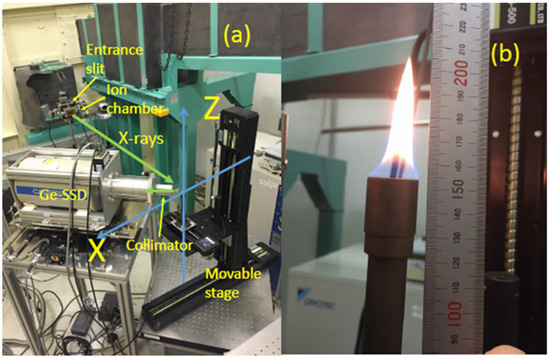 The experiment was performed at the BL08W beamline [7] in SPring-8. The linearly polarized X-rays were obtained from an elliptical multipole wiggler [8]. The synchrotron radiations were monochromatized and horizontally focused by an asymmetric Johann-type Si monochromator with (620) reflecting planes [9] to deliver 115.56 keV X-ray beams, which are the optimized energy on BL08W. Figure 1a shows a picture of the experimental setup of the present experiment. The size of the incident X-rays was defined by the entrance slit system to be 1 mm in height and 1 mm in width. An energy spectrum of Compton scattered X-rays from a flame in a probing volume was detected by a Ge solid state detector (Ge-SSD) with a collimating silt of 1 mm in height and 1 mm in width at a scattering angle of 133.8 degrees. Therefore, the probing volume was about 1 mm3. The intensity of incident X-ray beams was monitored by an ion-chamber for data normalization. Compton scattered X-rays were measured for 60 s with a 2 mm step in the x-axis and 5 mm step in the z-axis. A Compton scattered X-ray spectrum was measured for 38 min. A cylindrical Bunsen burner (inner diameter, din = 10 mm) was used to provide pure propane (99 wt.%, 60 mL/min). The burner provided a laminar diffusion flame as shown in Figure 1b. The burner was mounted on a movable stage and the intensity of Compton scattered X-rays from the probing volume was measured by scanning with the X-ray beams along the vertical (z) direction and horizontal (x) direction, which were on a plane perpendicular to the incident X-ray beam direction.