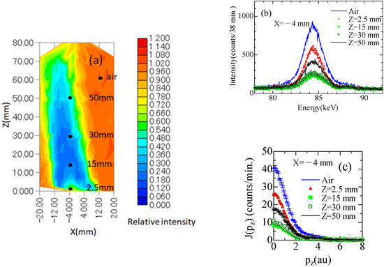Here a Compton profile, J(pz), shown in Figure 2c is normalized into J’(pz), which has a unit area as Equation (8). J’ zmm(pz) denotes a normalized Compton profile at z mm. J’air(pz) denotes the normalized Compton profile of air.